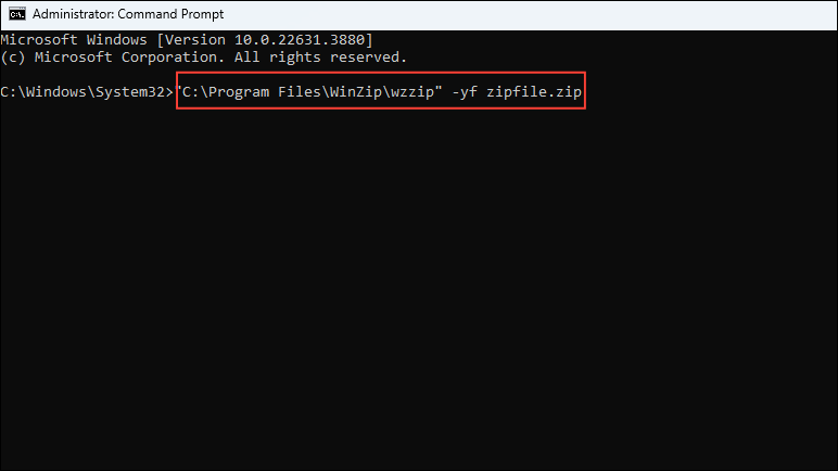 "C:\Program Files\WinZip\wzzip" -yf zipfile.zipand press the 'Enter' key. Make sure to replace the 'zipfile' with the name of your corrupted ZIP file.