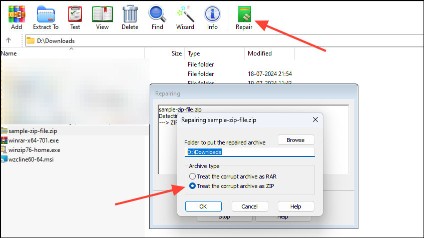 - Once WinRAR finishes repairing the file, you can try extracting it again.
