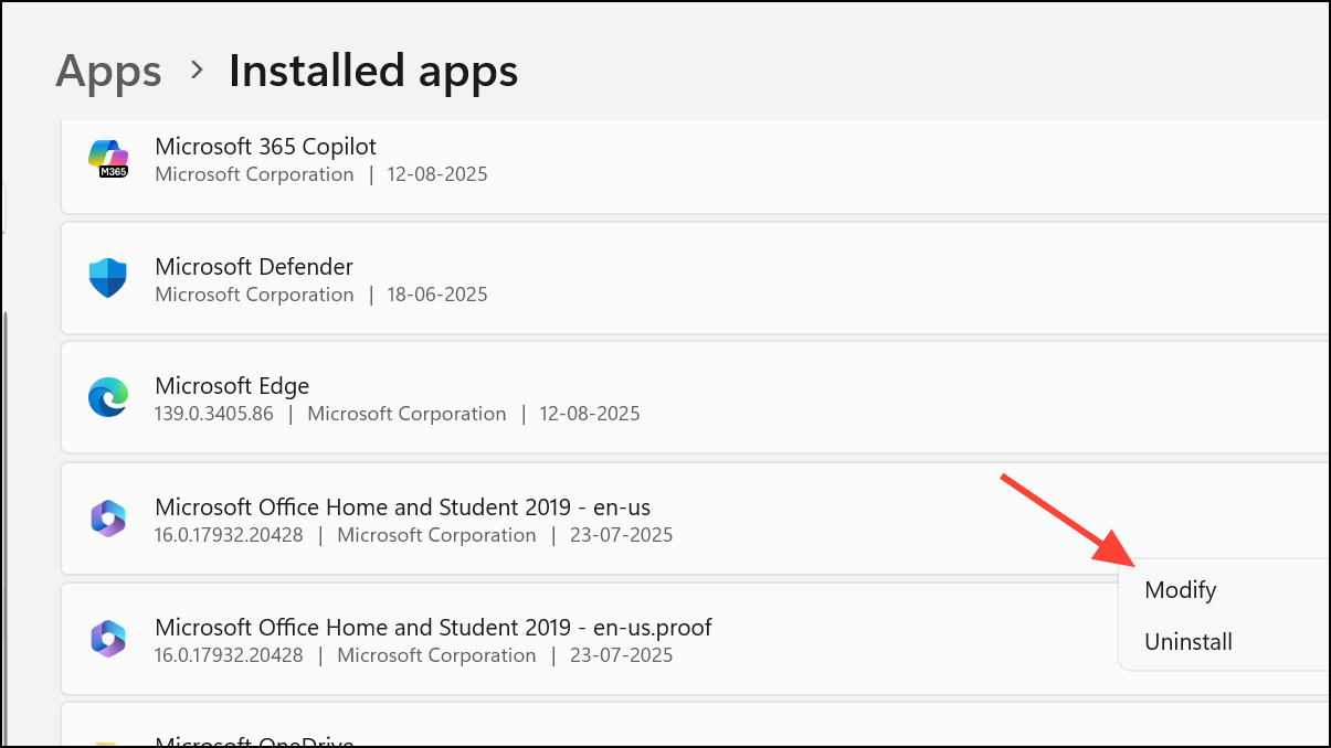 Step 3: Click the three-dot menu (...) next to the Office entry and select Modify. This opens the Office repair dialog.