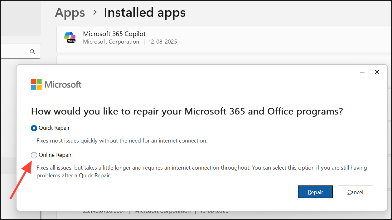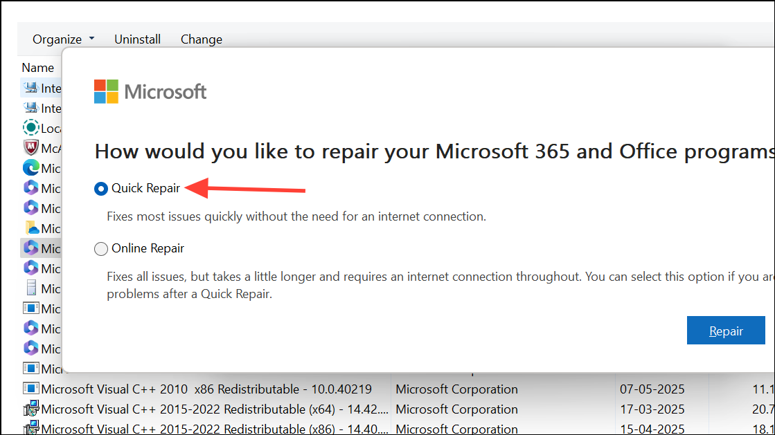 Step 4: Choose Quick Repair and confirm by clicking Repair. Quick Repair uses local files to fix minor issues, such as missing or corrupted components, without requiring an internet connection. The process usually takes a few minutes, and you’ll see a progress bar indicating activity.