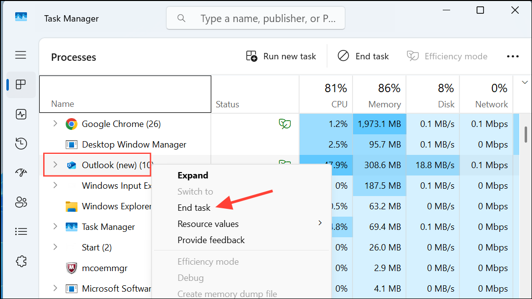 Step 1: Close Outlook completely. Ensure that Outlook is not running in the background by checking the system tray (near the clock) and the Task Manager. Press Ctrl + Shift + Esc to open Task Manager, locate "Microsoft Outlook" under the Processes tab, right-click it, and select "End Task."