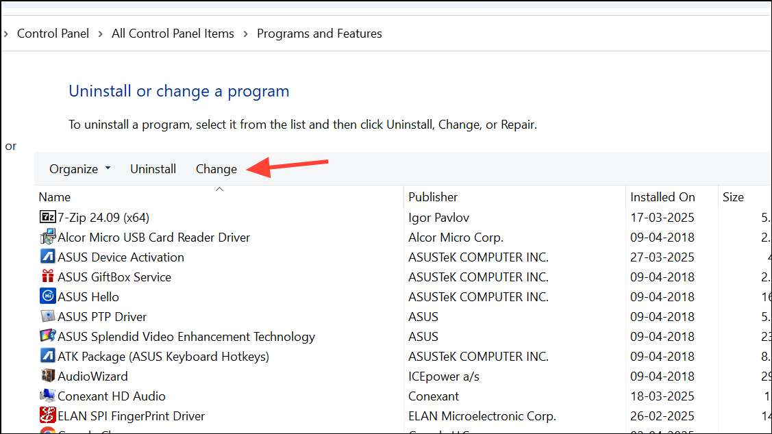 Step 4: Locate "Microsoft Office" or "Microsoft 365" in the list of installed applications. Click once to highlight it, and then select "Change" from the top menu bar.