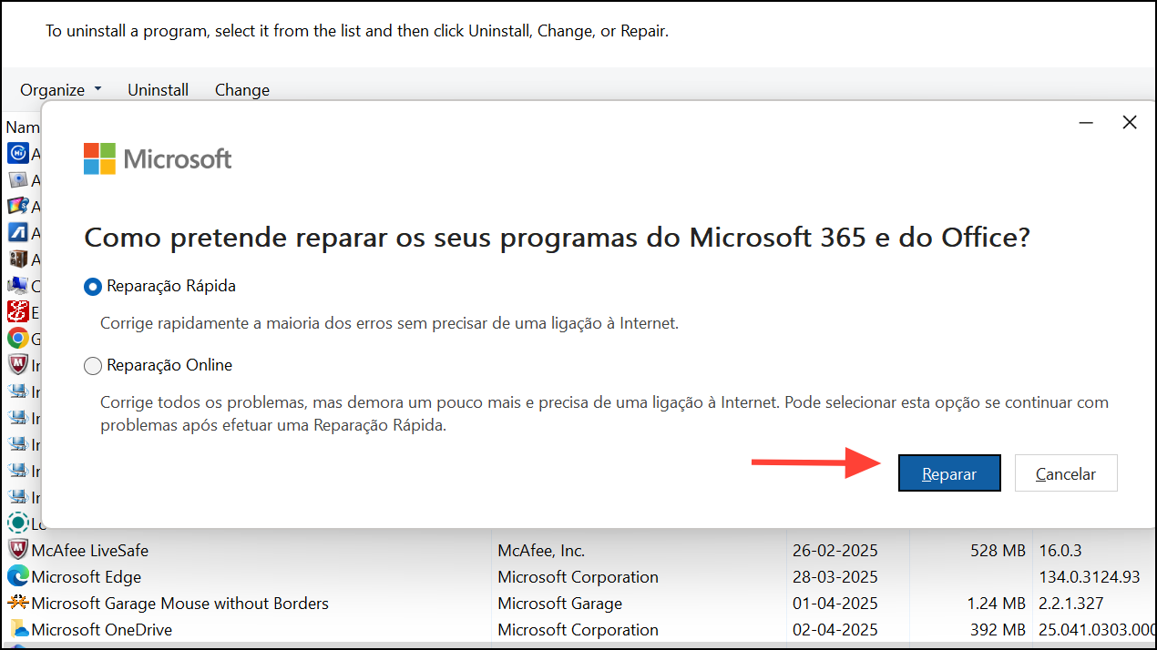 Method 1: Repair Outlook via Control Panel