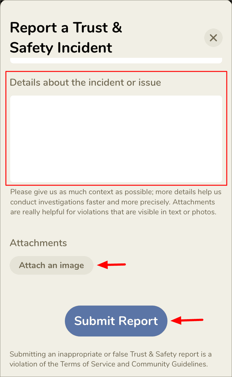 Now, enter the description of the incident or issue, you are reporting the user for. Adding a picture as proof will certainly strengthen your case, however, it’s not mandatory. After you have completed the form, tap on ‘Submit’ at the bottom.