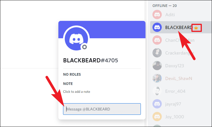 Then, head to the member’s list situated on the right edge of your screen. Then, find the crown badge, or a ‘Moderator’/’Admin’ badge just beside their name and click on it; they would be the ones who can take appropriate actions upon reporting. This will bring up a floating window on your screen.