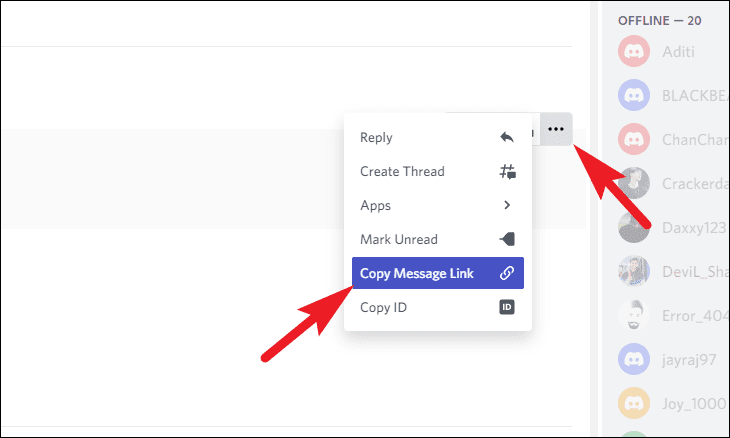 After that, in case you wish to report a specific message, head to the particular message and hover over it; then, click on the ellipsis that appears on the right-most edge of it and select the ‘Copy message link’ option.