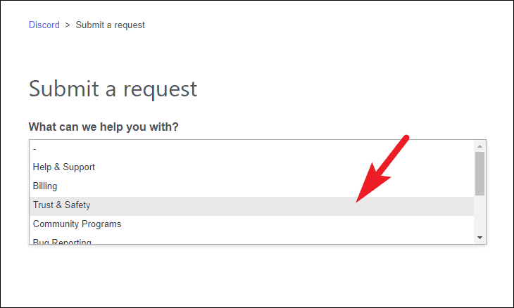 Next, head to the Disord’s request submission page support.discord.com/requests and click on the drop-down menu present on the webpage. Then, select the ‘Trust & Safety’ option.