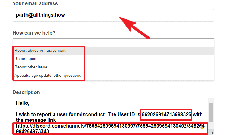 Finally, enter your e-mail address in the respective field and click on the drop-down menu present under the ‘How can we help?’ section, and select the appropriate option. Next, enter the subject in the ‘Subject’ field and paste the User ID you copied earlier in the ‘Description’ box along with the description of your issue. If you also copied the message link previously, paste it here.