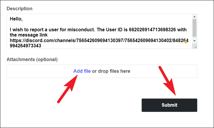 At last, if you have any evidence or proof of the violation, add them by clicking on the ‘Add file’ button. Once you have completed the form click on the ‘Submit’ button to report the user.