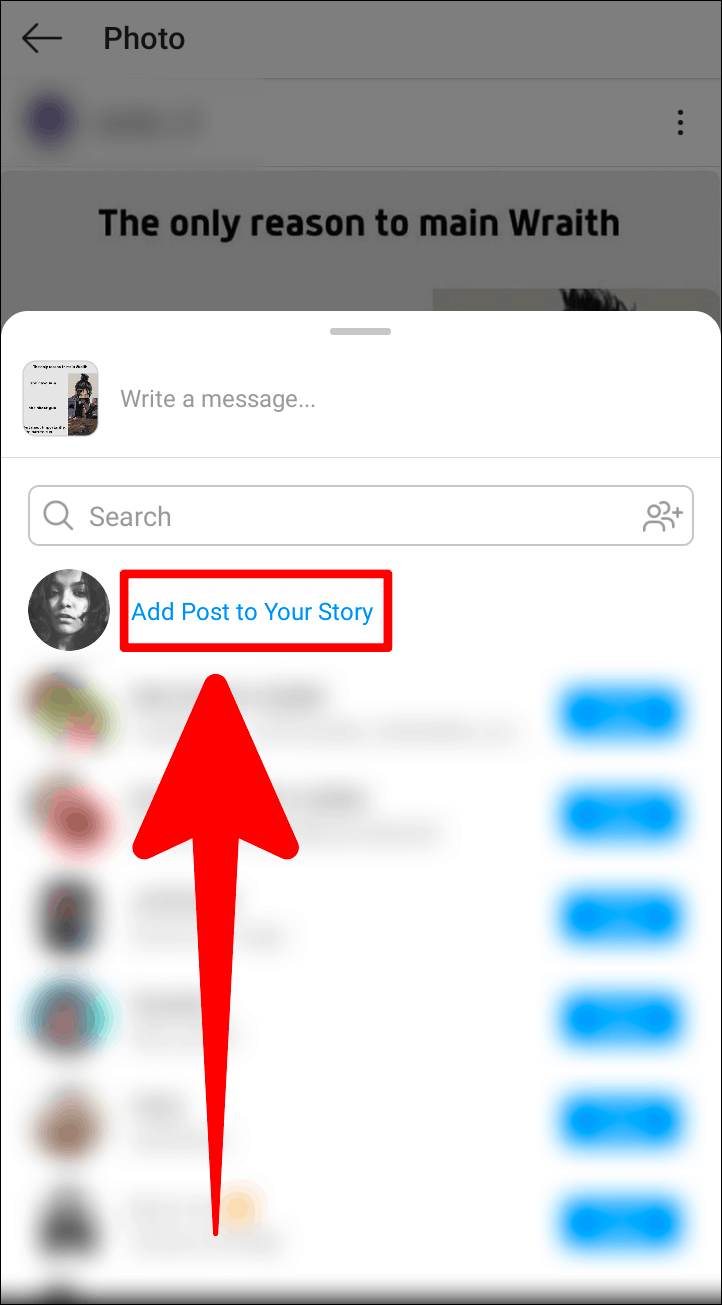 When you hit ‘Send’ you’d be shown your frequented contacts and other followers you’d like to share this story with. But, you want to add it to your story; basically, repost it. So, tap on the ‘Add Post to Your Story’ option. It would be the first on the entire ‘Send’ list.