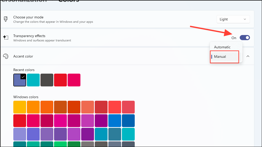 Step 4: Ensure 'Transparency effects' are turned on, and set 'Accent color' to 'Manual'.