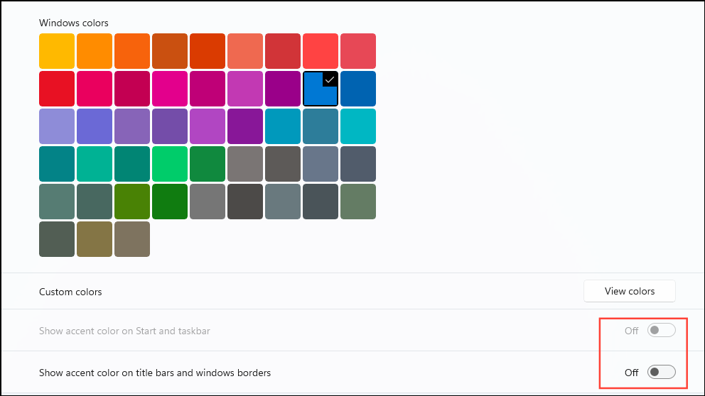 Step 5: Under 'Accent color', select 'Blue' from the Windows colors. Disable 'Show accent color on Start and taskbar' and 'Show accent color on title bars and windows borders' by toggling them off.