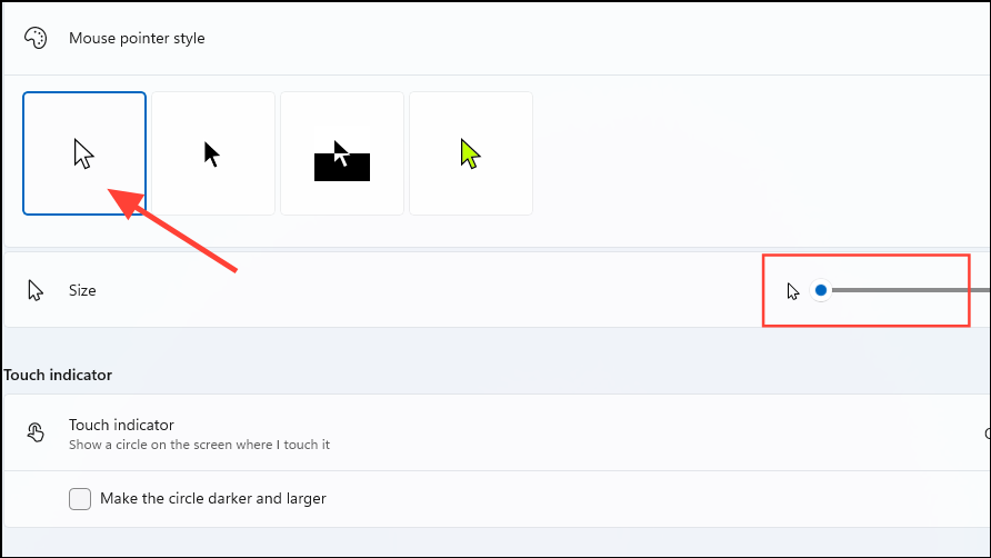 Step 2: Choose the first pointer option (white with black border) and adjust the size slider to the default position.