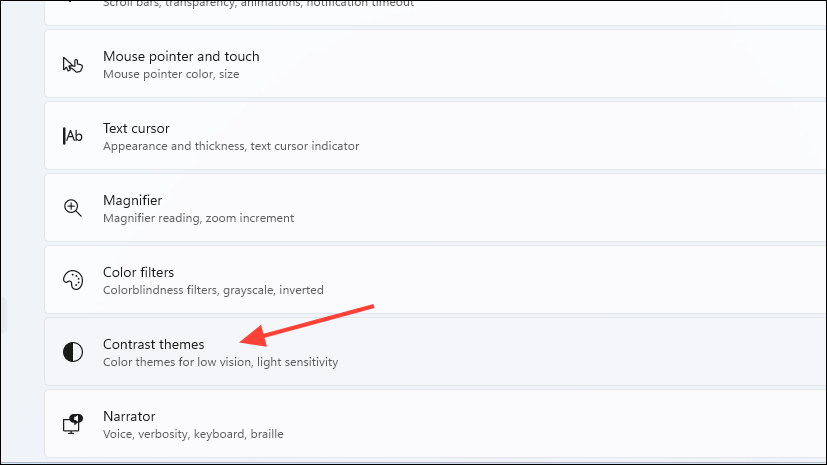 Step 1: In the 'Accessibility' settings, select 'Contrast themes'.