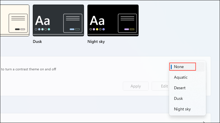 Step 2: In the 'Contrast themes' section, choose 'None' from the dropdown menu and click 'Apply'.