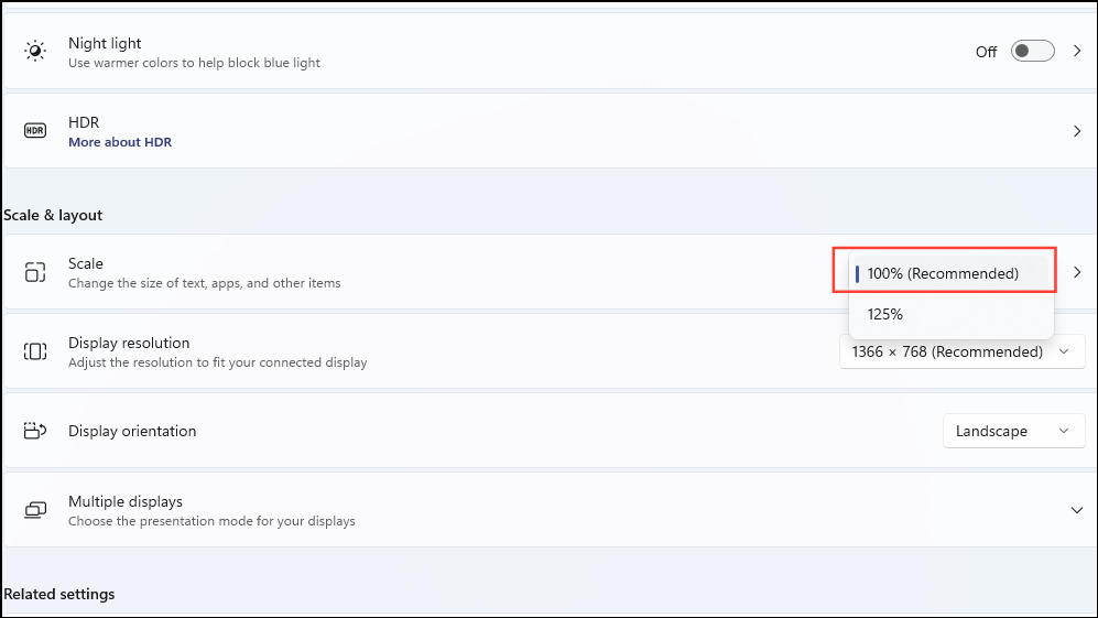 Step 2: Next to 'Scale', click the dropdown menu and select the recommended percentage (usually 100% or 125%).