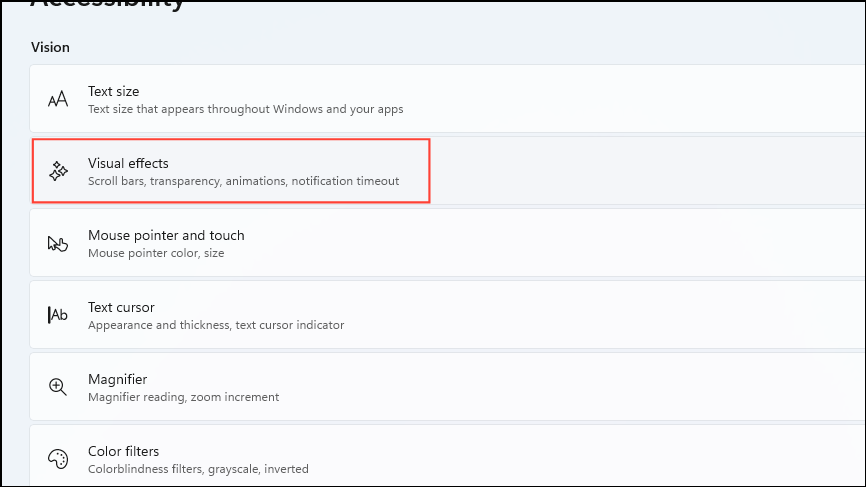 Step 1: In 'Accessibility' settings, click on 'Visual effects'.