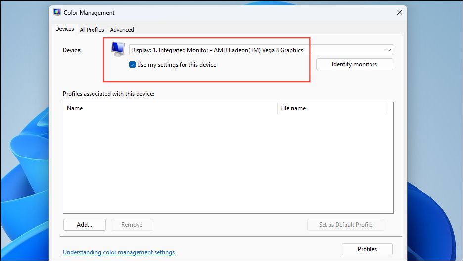 Step 2: In the 'Devices' tab, select your monitor and check 'Use my settings for this device'.