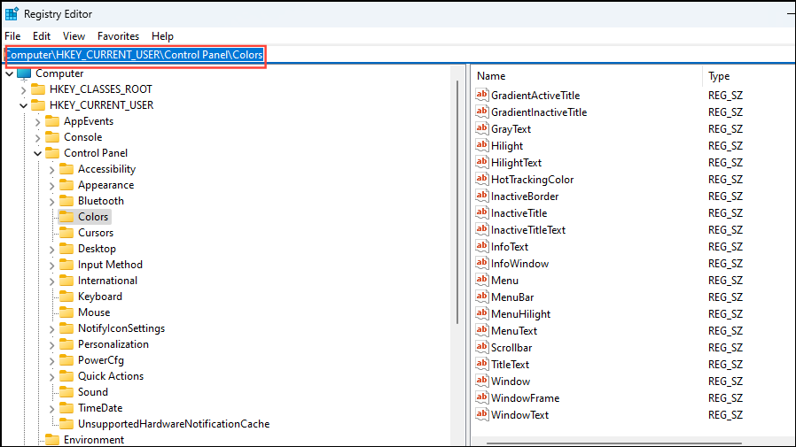 Step 2: Navigate to HKEY_CURRENT_USER\Control Panel\Colors.