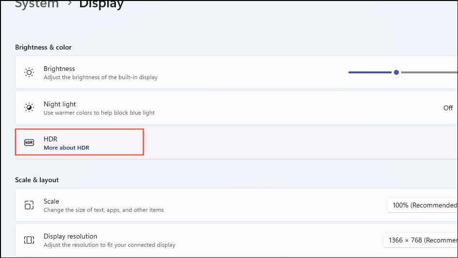 Step 1: In the Display settings, click on the 'HDR' option under 'Brightness & color'.
