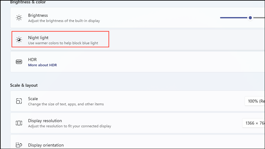 Step 1: In the Display settings, click on the 'Night light' option under 'Brightness & color'.