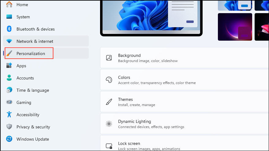 Step 1: Open the Settings app and select 'Personalization' from the left sidebar.