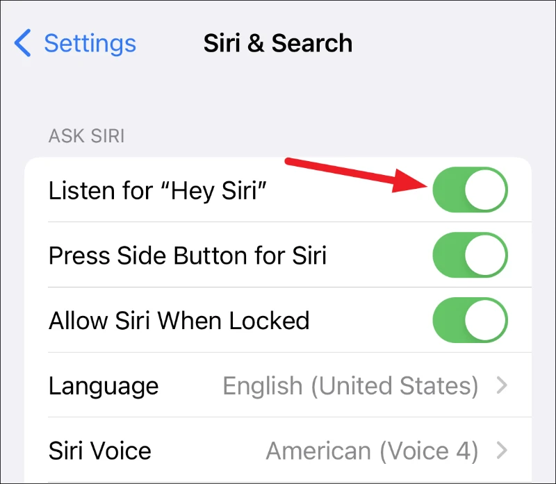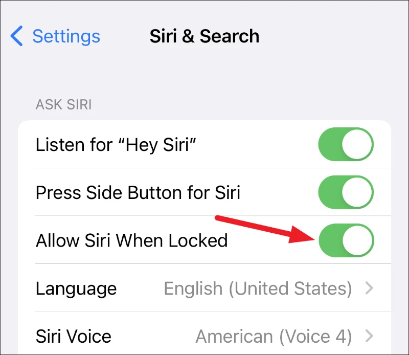Next, make sure that the toggle for ‘Allow Siri When Locked’ is also on. If it’s off, iPhone won’t listen to your Hey Siri requests when it’s locked, making you think something’s wrong with Siri’s voice recognition.