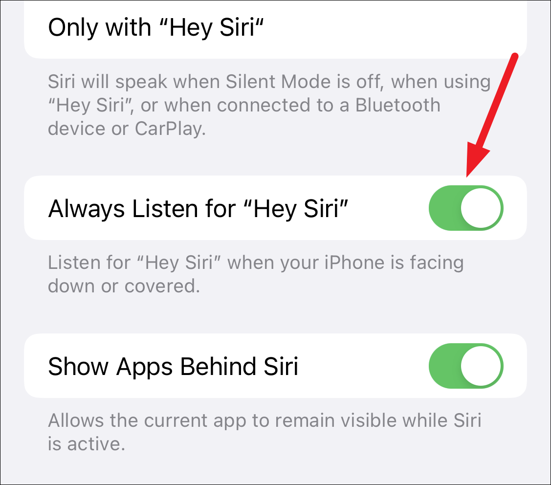 Here, turn on the toggle for ‘Always Listen for “Hey Siri”‘.