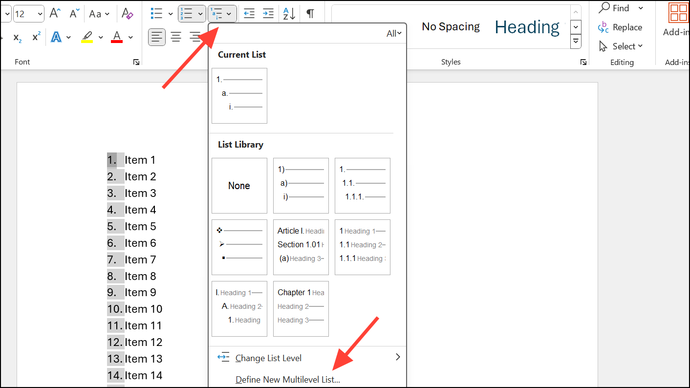 Step 1: Go to the Home tab, click the Multilevel List button, and choose Define New Multilevel List.