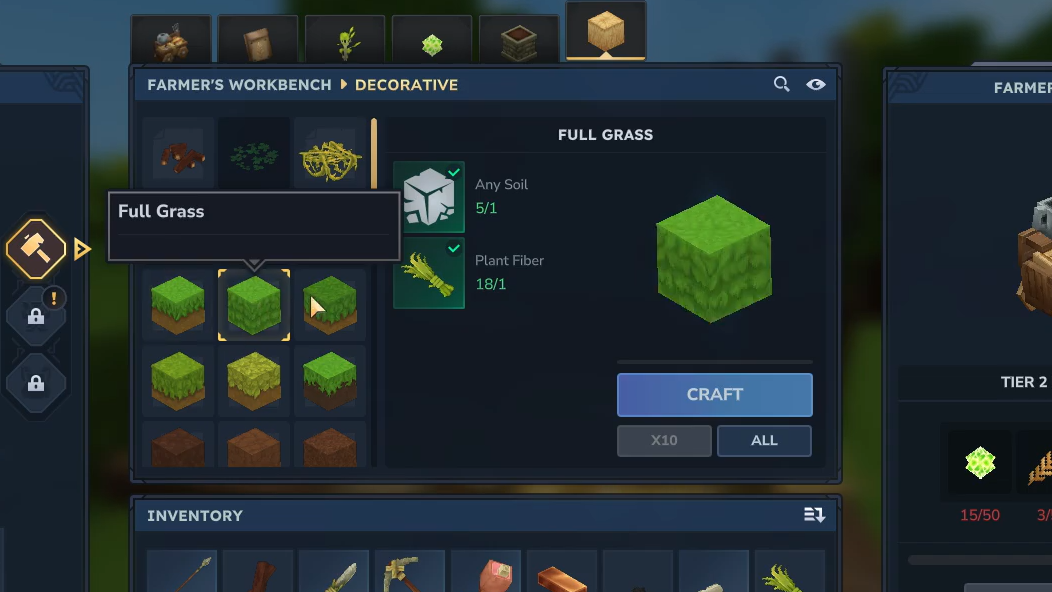 Step 2: Use the Farmer’s Workbench Decorative tab. Interact with the bench, switch to Decorative, and scroll to the grass entries. Start with “Full Grass” for a general green block, then queue up any biome‑specific grasses you want for accents, such as Dry Grass in deserts or Cold Grass in frozen regions.