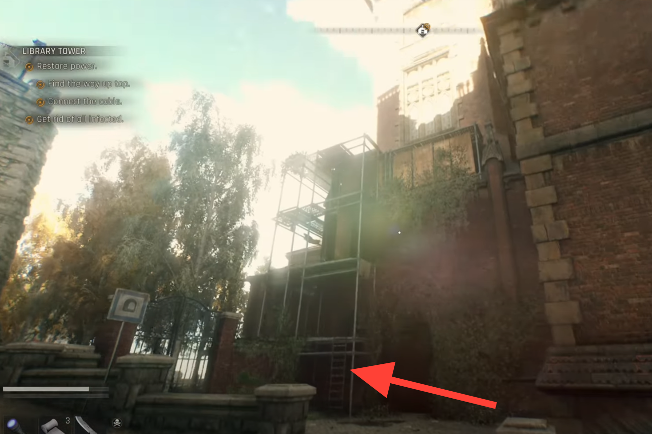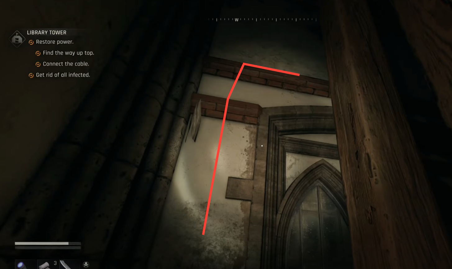 Step 1: At the base of the Library Tower, use the exterior scaffolding and ladders to ascend to an open window. This is the intended entry; other exterior surfaces here are decorative and won’t register climbs.