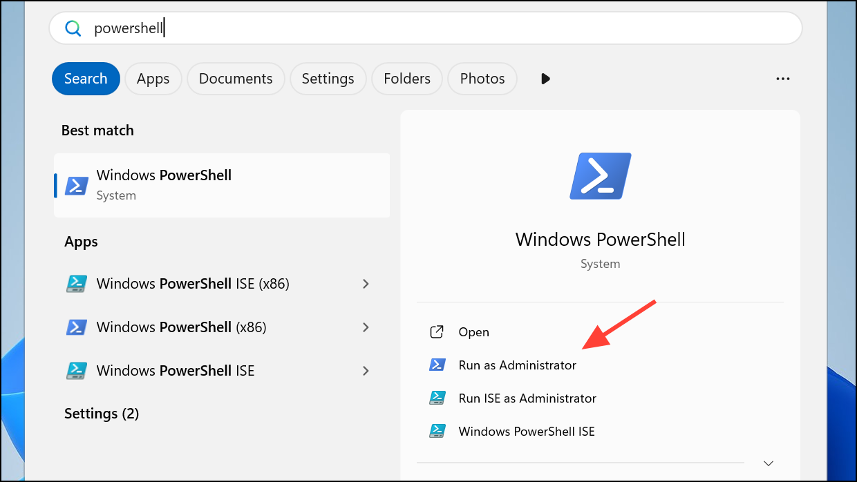 Step 1: Open PowerShell as an administrator from the Start menu by searching for it and selecting Run as administrator.