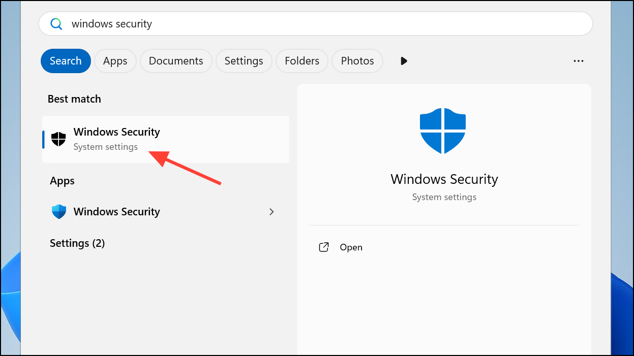 Step 1: Open the Windows Security app by typing Windows Security into the Start menu and selecting the matching result. This app manages security features including virus and threat protection.