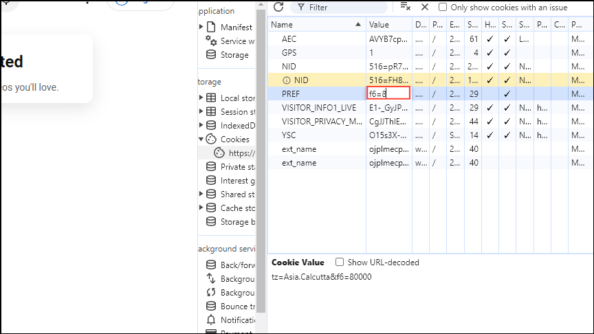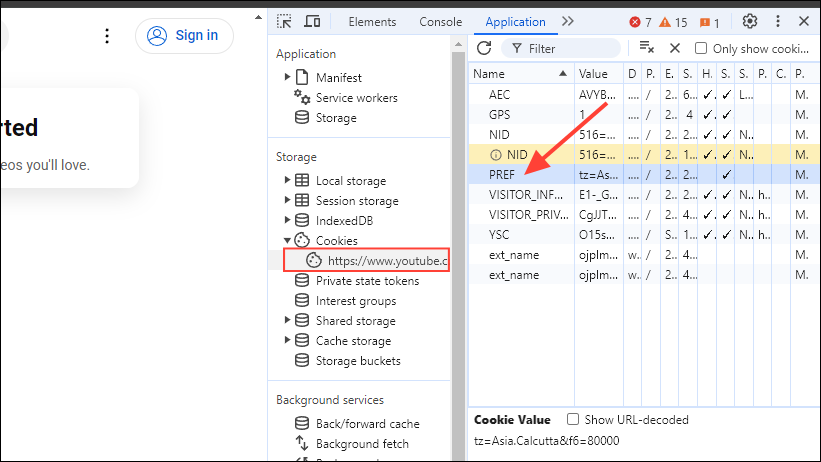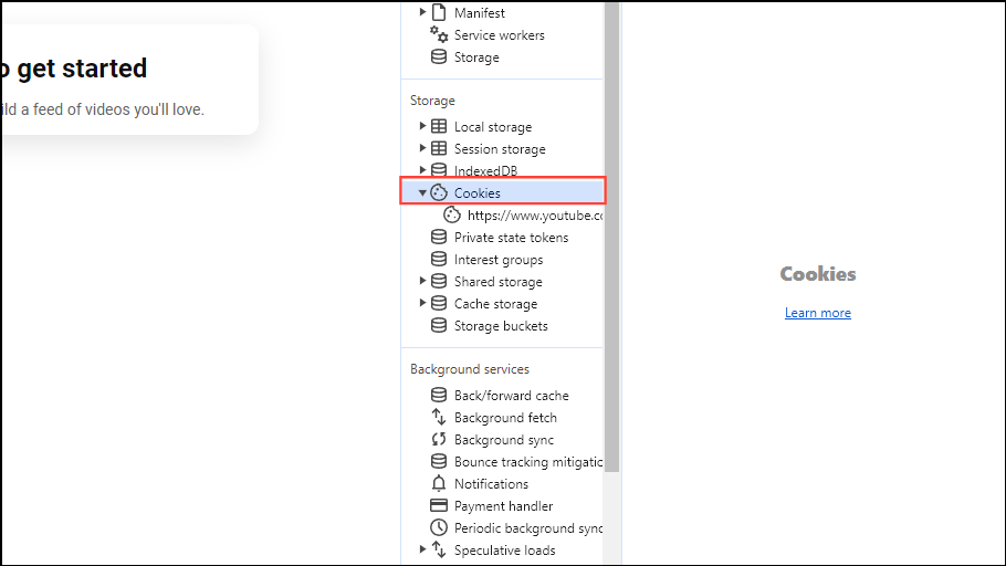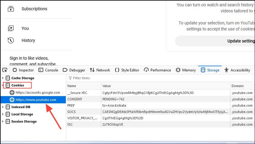 - Click on the 'Cookies' option on the left to expand it and then click on YouTube.