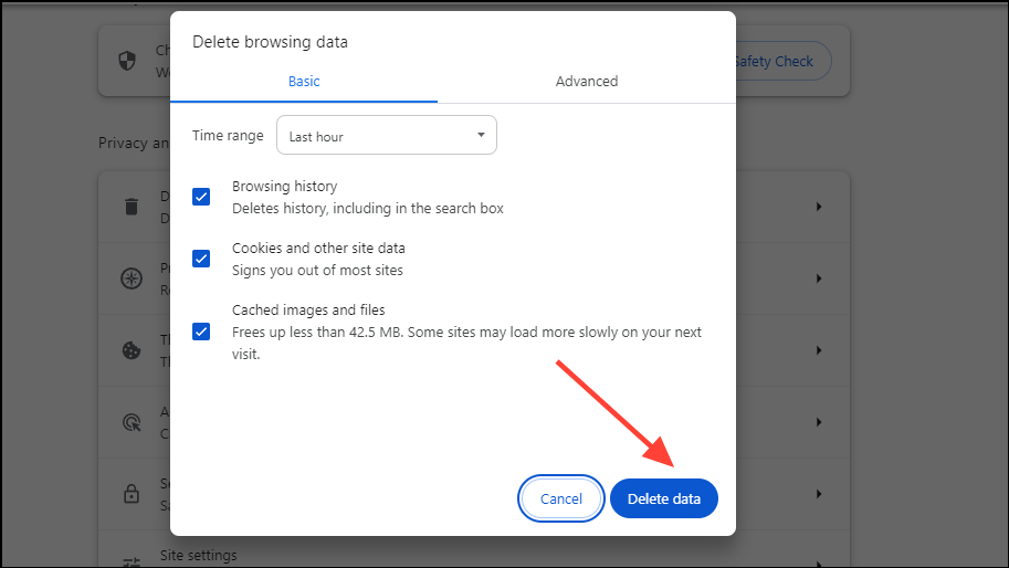 - Make sure Cookies, Site data, and cache data are all selected before clicking on the 'Delete data' button. You can choose the period for which the data will be deleted.