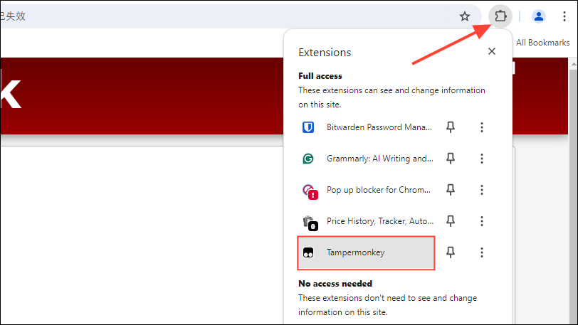 - Now, click on the Extension button in your browser and click on the TamperMonkey extension.