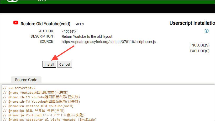 - On the page that opens, search for the 'Restore Old YouTube' script. Scroll down and click on the 'Install' button when the script appears.