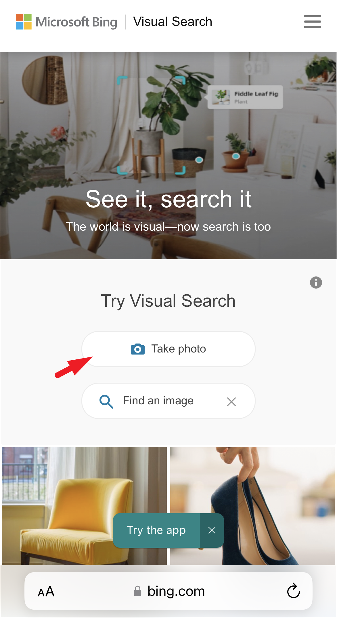 First, head to www.bing.com/visualsearch using a preferred browser on your iPhone. Then, tap on the ‘Take Photo’ button.
