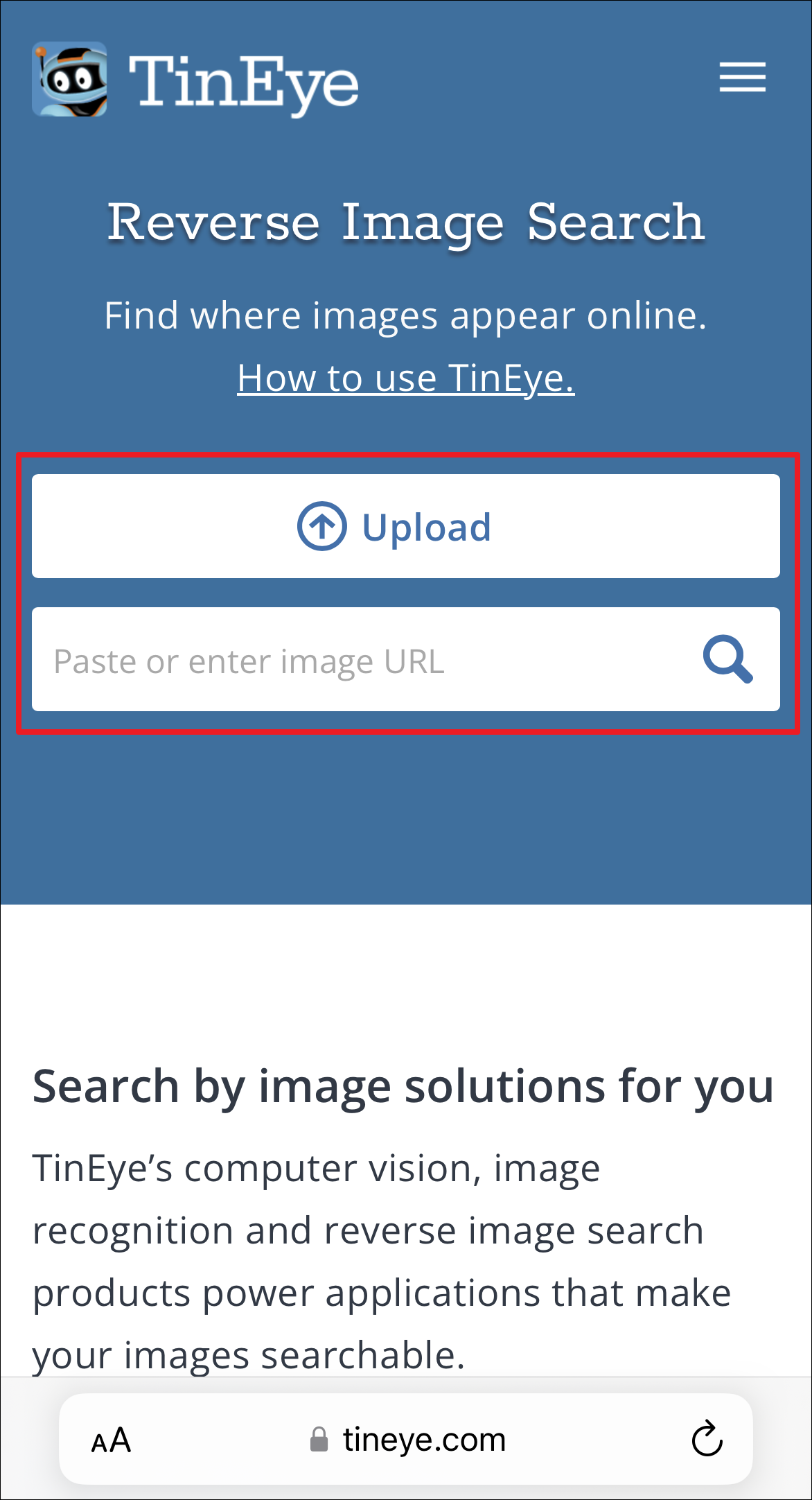In case the Google or Bing option does not work for you, there are many websites that allow you to perform a reverse image search. One of the very popular sites is TinEye.
