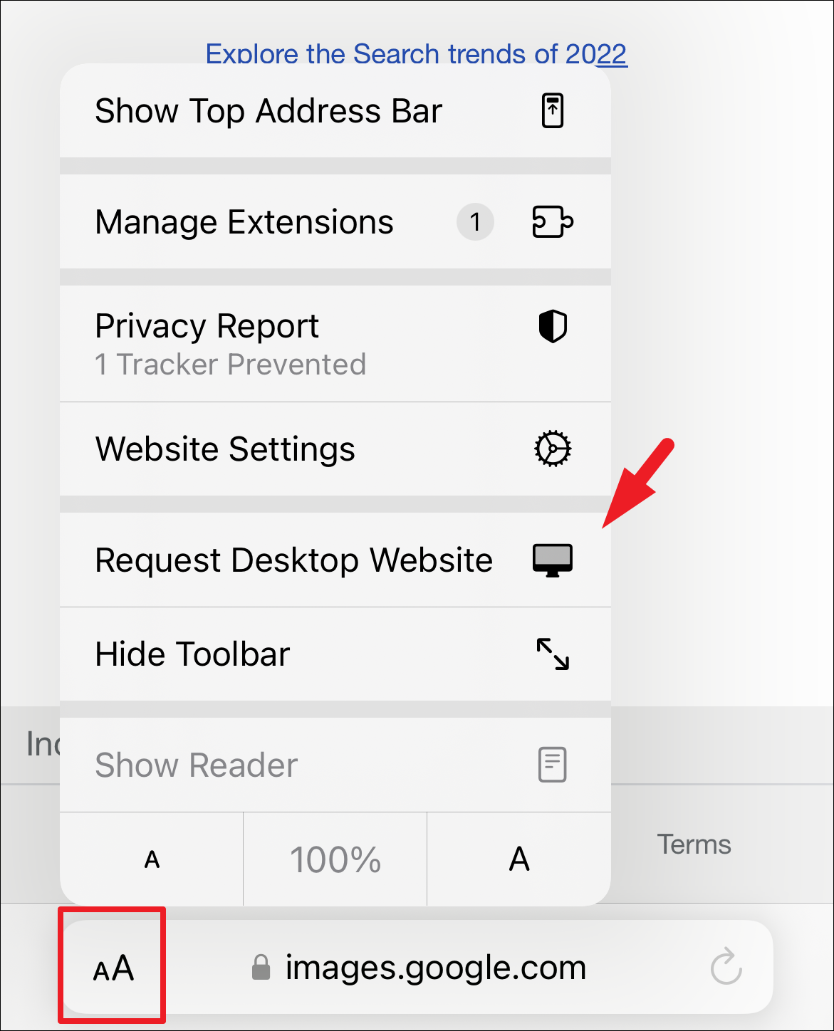 After that tap on the ‘aA’ button on the left corner of the address bar. Then, tap on the ‘Request Desktop Website’ option to continue. This will reload the website again.