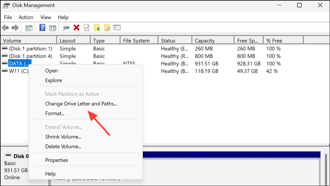 Step 3: Right-click the target volume and choose Change Drive Letter and Paths.... If this option is unavailable (grayed out), the partition might be a system, recovery, or EFI partition, or you might lack the necessary permissions. For accessible data drives, this menu should be active.