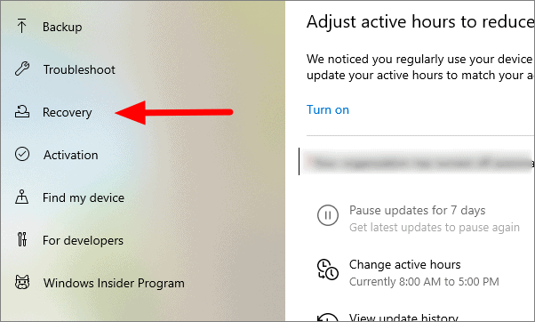 On the next window, select ‘Recovery’ on the left side of the screen.
