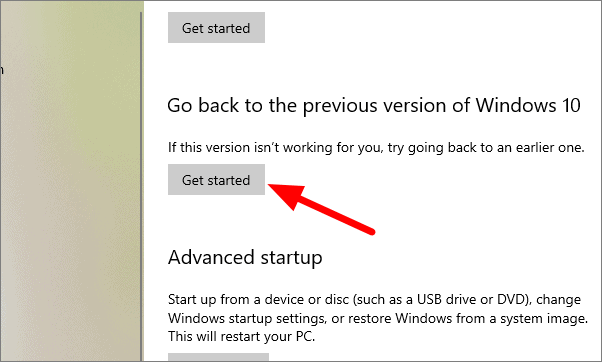 Click on ‘Get started’ under ‘Go back to the previous version of Windows 10’ so you can roll back to the last version.