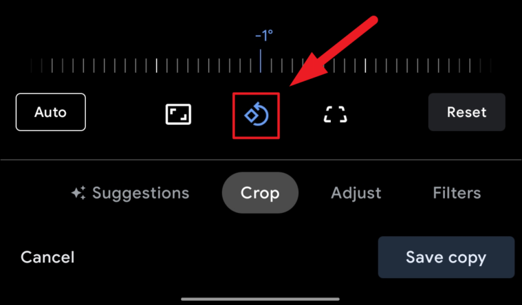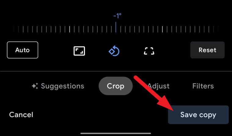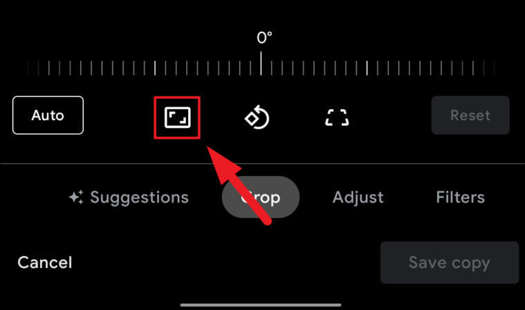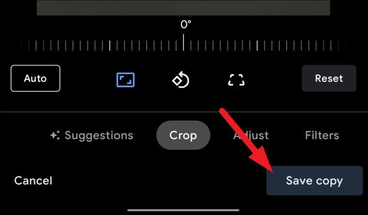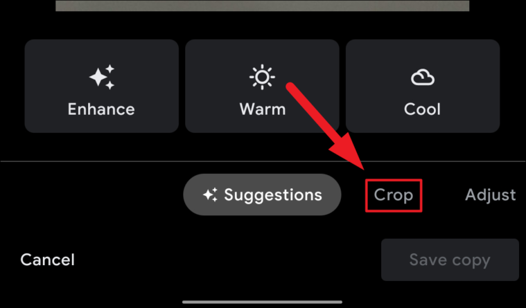 Now, from the Google Photos editor interface, click on the ‘Crop’ tab adjacent to the ‘Suggestions’ tab present on the bottom section of the screen.