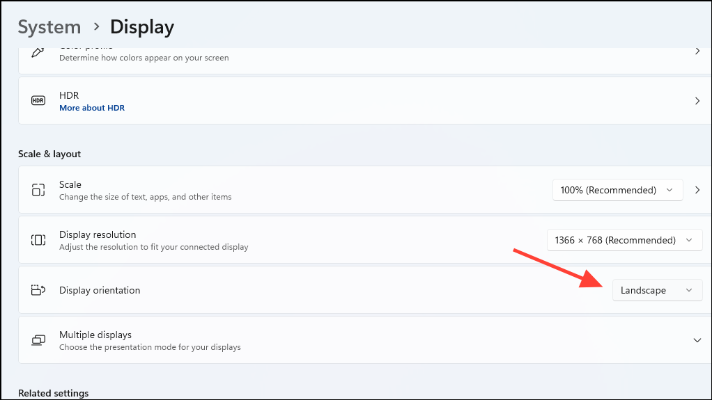 Step 2: In the Display settings window, scroll down to the "Scale & layout" section. Find and click on the dropdown menu labeled "Display orientation."