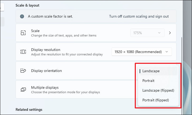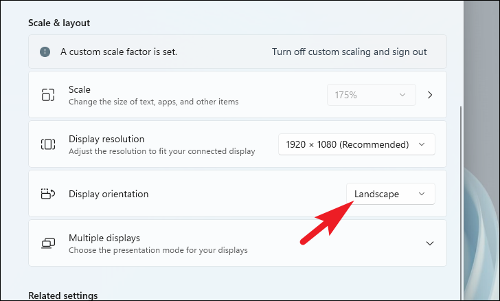 Step 4: Scroll down to the Scale & layout section. Click on the drop-down menu next to Display orientation to view the available options.