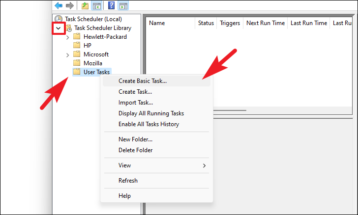 Step 3: Expand the Task Scheduler Library, right-click your new folder, and select Create Basic Task.