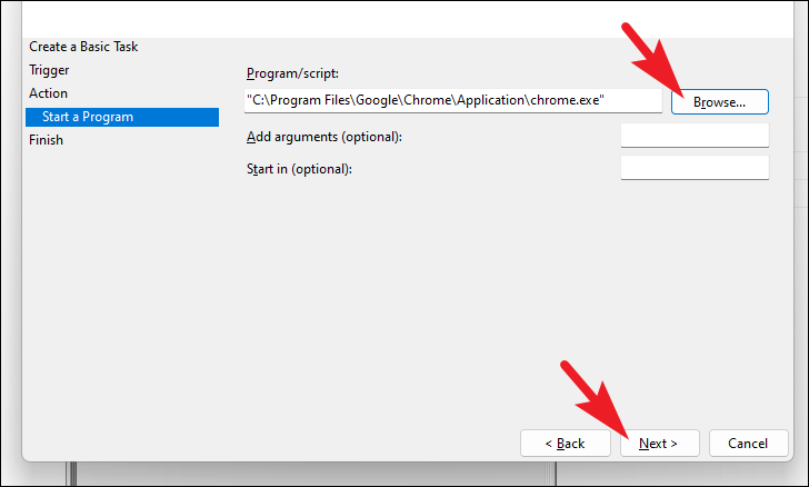 Step 7: Click Browse and navigate to the application's .exe file you want to run. Select it and click Open, then click Next.