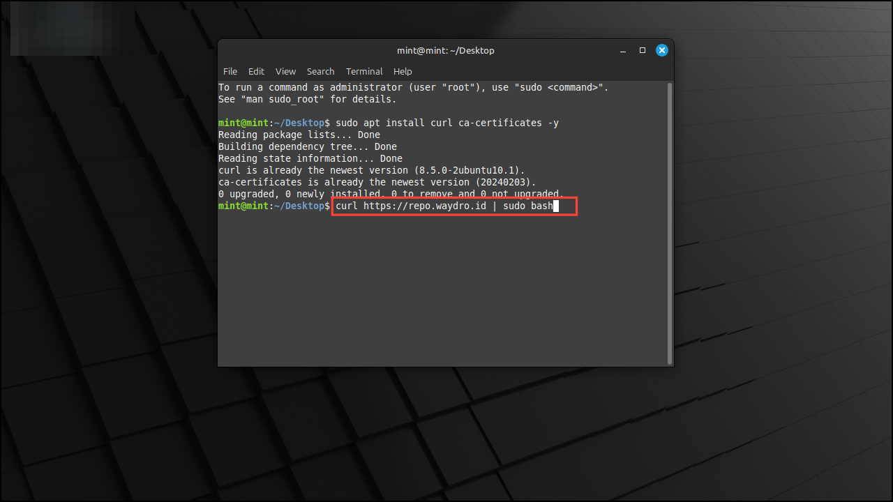 curl https://repo.waydro.id | sudo bashand press Enter to add the WayDroid repository.