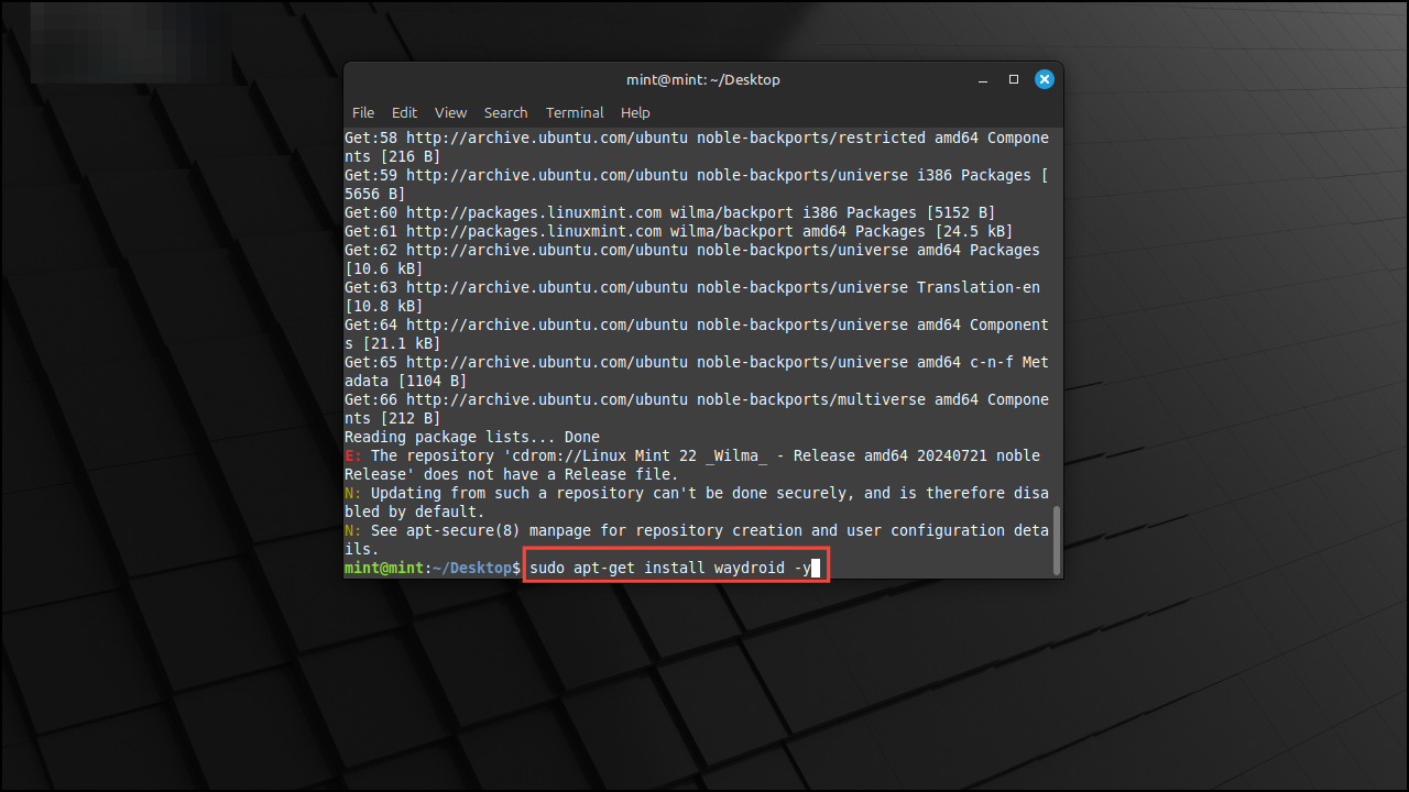 sudo apt-get install waydroid -ycommand and pressing Enter.